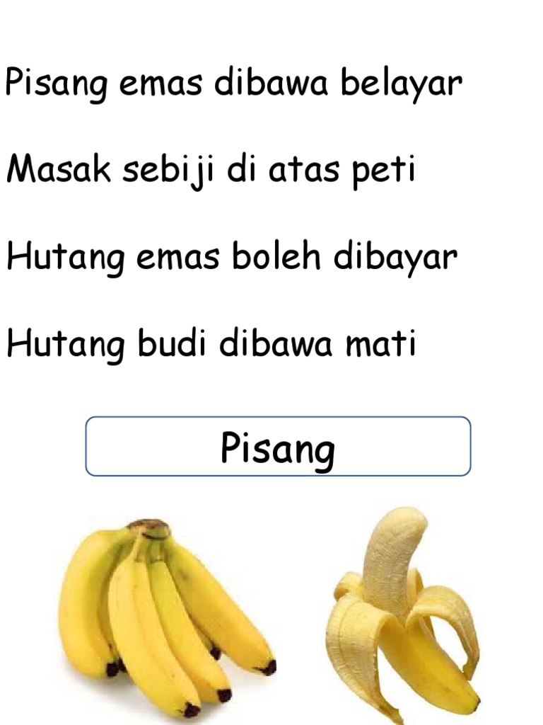 Pisang emas dibawa belayar Masak sebiji di atas peti Hutang emas boleh dibayar Hutang budi dibawa mati. Pakcik goreng pisang mana menega malam2. Pisang emas dibawa berlayar Masak sebiji di atas peti emas boleh dibayar Hutang.